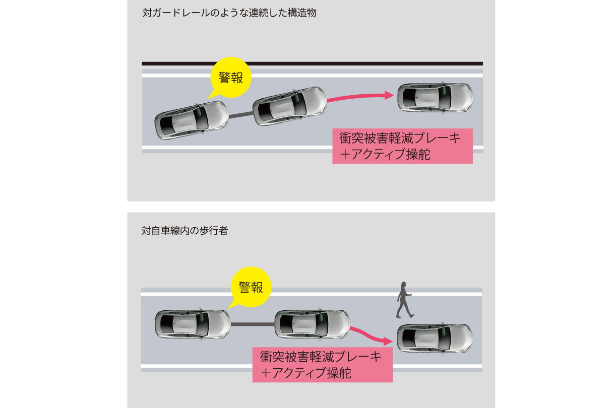 ■回避するための十分なスペースがない、また、回避先に物があるとシステムが判断した場合には作動しません。 ■横断歩行者など一定以上の速度を持った対象には作動しない場合があります。