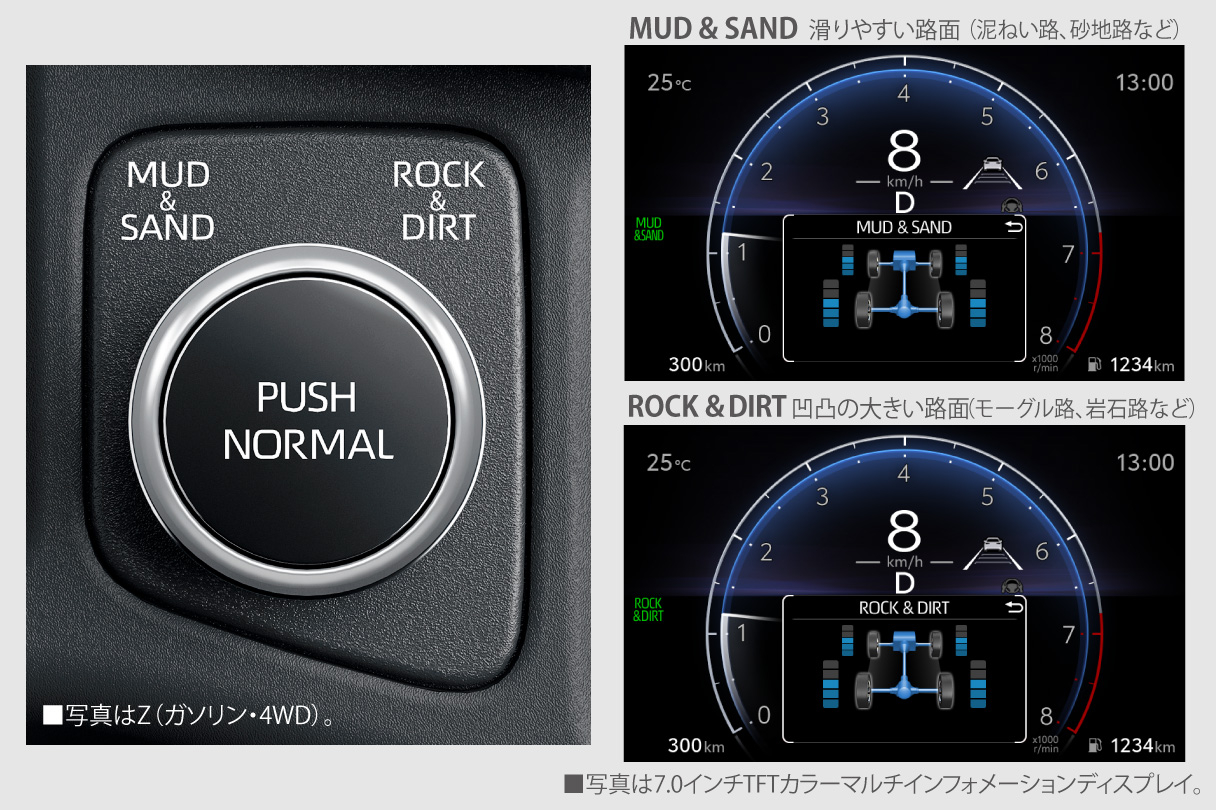 路面状況に応じた走行支援を、3つのモード(MUD&SAND/NORMAL/ROCK&DIRT)から選択できるシステムです。路面状況に適したモードを選択すると、駆動力、4WD、ブレーキを最適に統合制御。オフロードや滑りやすい路面での走破性を向上させます。またシステムの作動状況をマルチインフォメーションディスプレイに表示し、運転をサポートします。